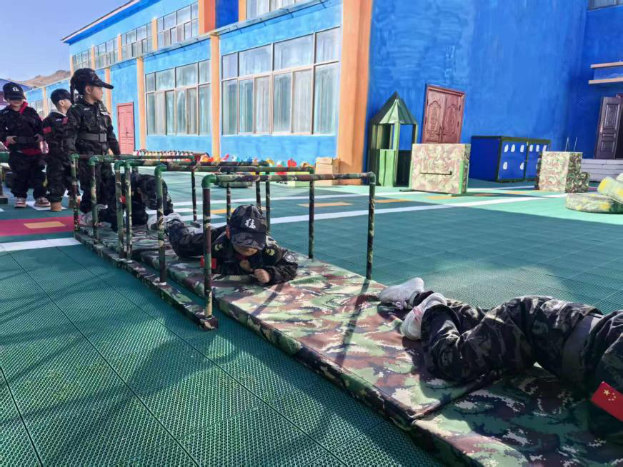 错那市幼儿园作为边境县幼儿园,积极探索将国防教育融入幼儿日常活动的有效途径。11月我园成功组织开展了《我是边疆小战士》为主题的一系列以国防教育为特色的户外自主游戏活动,活动通过寓教于乐的方式,在孩子们心中播下爱国、卫国、强国的种子。围绕活动主题各班教师结合幼儿年龄特点、认知水平、生活经验,对户外活动场地进行了精心规划与布置。活动中,各班利用平衡木、钻洞、跨栏、攀爬架、观察瞭望台、迷彩隐蔽区、轮胎、对讲机、沙包、手枪、手雷弹、软垫、小背囊等低结构、可组合的游戏材料,在教师引导下,孩子们自主选择角色、材料,开展了“边境小巡逻员“物资运输线”“重走长征路”“我是勇敢的小哨兵等一系列活动。