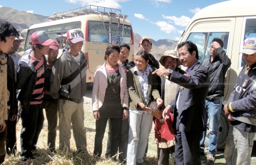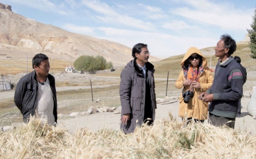 尼玛扎西(左二)在阿里地区札达县调研青稞种植情况。