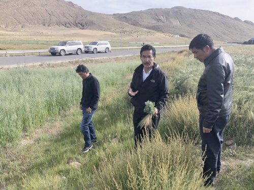 尼玛扎西(左)在海拔最高的青稞种植区周围调研披碱草。