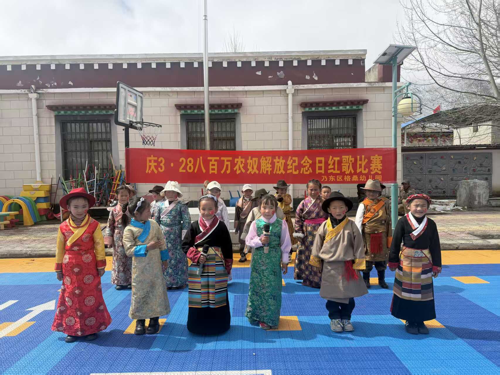 乃东区结巴乡格桑村幼儿园:为纪念西藏百万农奴解放75周年,增强幼儿的爱国情感和民族团结意识,结巴乡格桑村幼儿园于3月27日开展了“铭记历史,童心向党”系列红歌比赛活动。活动在庄严的升旗仪式中拉开序幕,孩子们身着民族服饰,共同祝愿伟大的祖国繁荣昌盛。通过此次红歌比赛,孩子们初步了解了“3.28”纪念日的意义,感受了新旧西藏的巨大变化。活动不仅让孩子们知道了幸福生活的来之不易,更在他们的心中播下了爱党、爱国、热爱社会主义新西藏的种子。