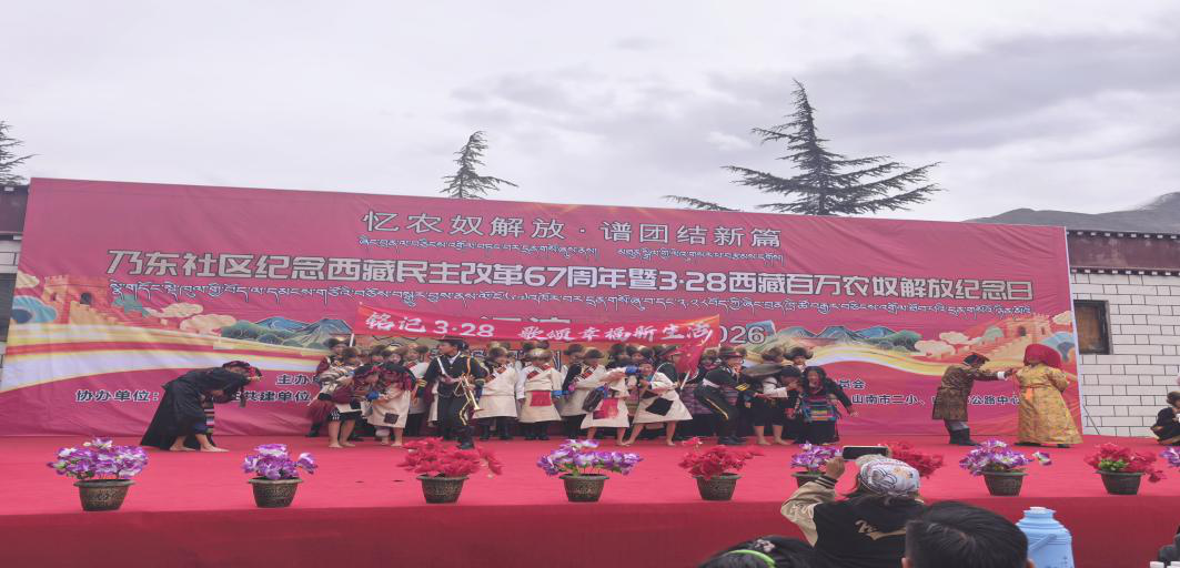 市二小:为隆重纪念3·28西藏百万农奴解放67周年,厚植学生爱党爱国爱社会主义情怀,引导少年儿童铭记历史、珍惜当下、奋进未来,2026年3月28日上午,山南市第二小学组织学生走进社区,参与由山南市乃东社区主办的纪念主题文艺表演活动。
